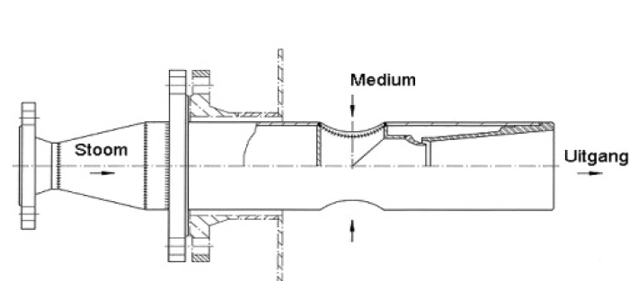 Stoominjector installatie in-line, in een tank of heetwaterstation