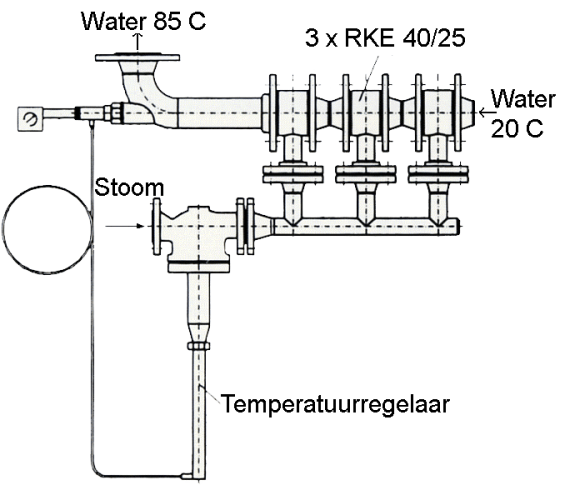 Een hoeveelheid water van 6000 liter/per uur wordt verwarmd van 20oC tot 90oC door 3 aan elkaar gekoppelde stoominjectoren type RKE 40/25 met een stoomcapaciteit van 3x280 kg/uur = 840 kg/uur. Bij toepassing van meerdere injecteurs kan een grote Δt , opwarming van het water bereikt worden.